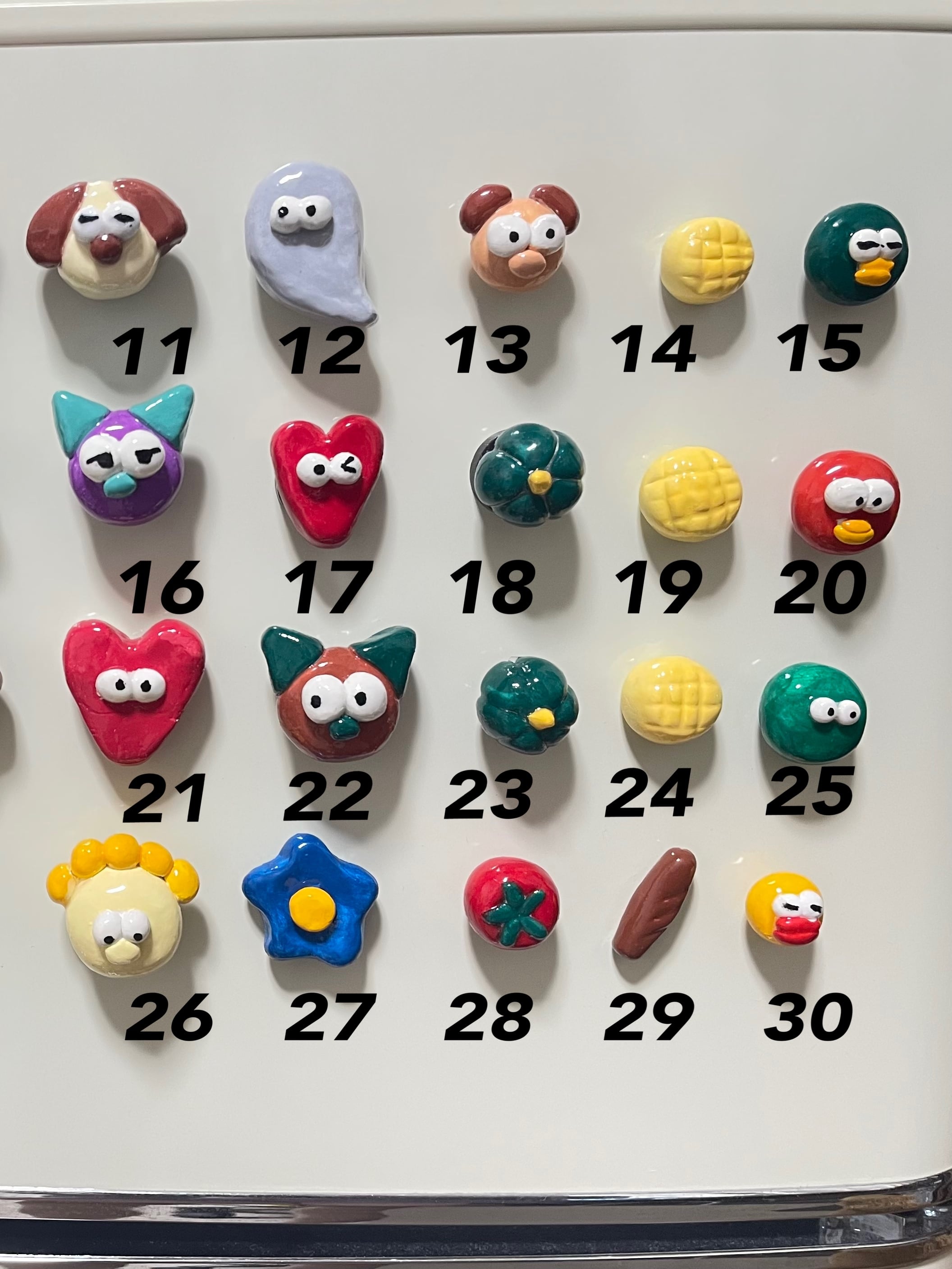 ひとつひとつ紙粘土で形を作り、絵の具で彩色したハンドメイドのマグネットです。